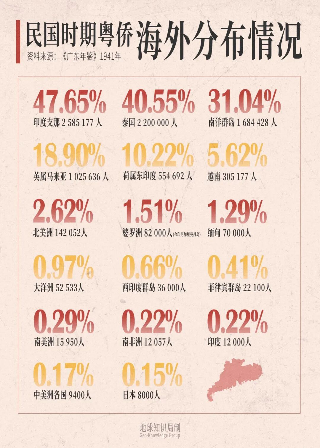 至民国时期,广东已经成为了华侨人数最多的地区,粤侨在全国华侨中占比超过一半。而他们的目的地,大多是印度支那、泰国、南洋群岛等地,