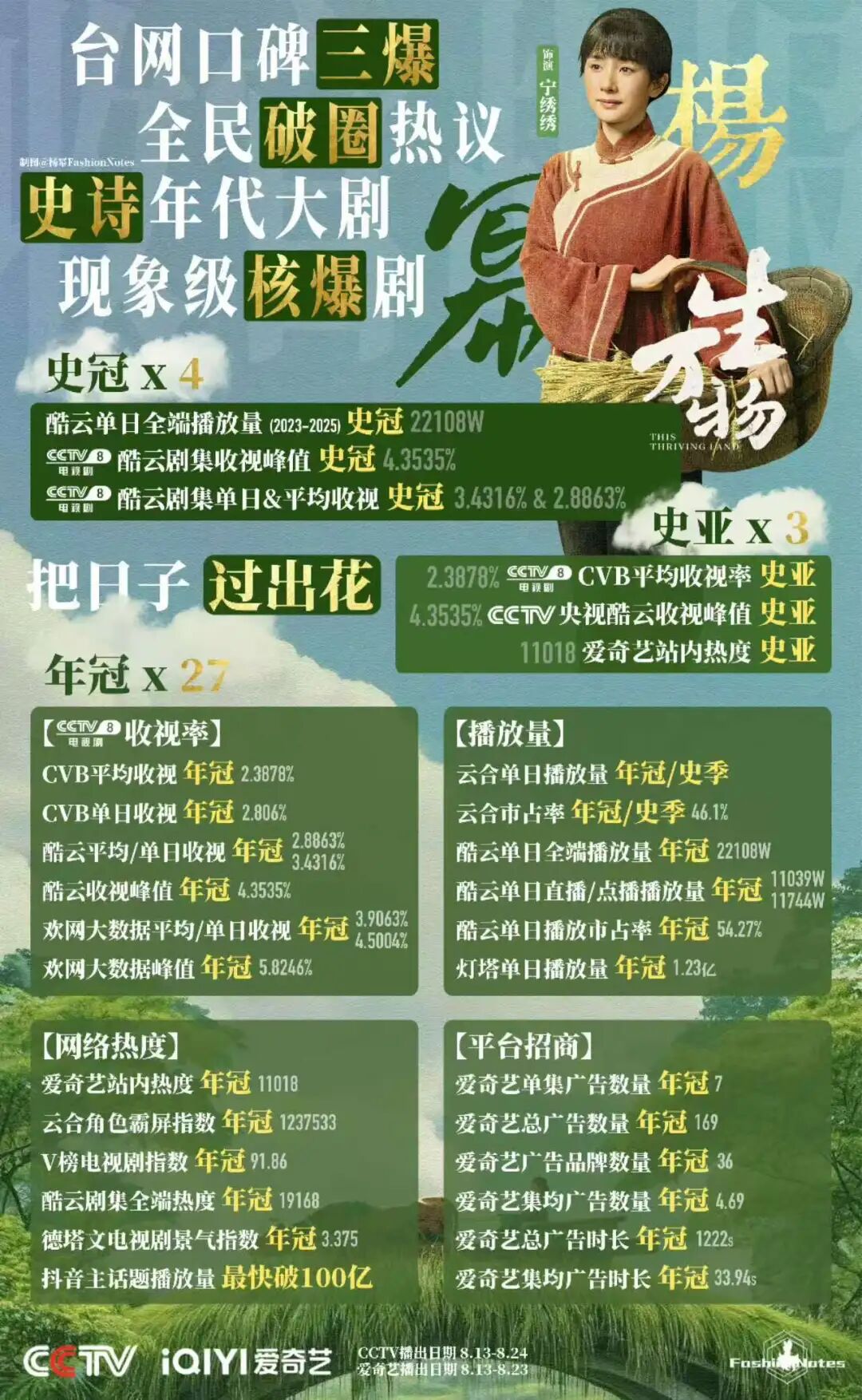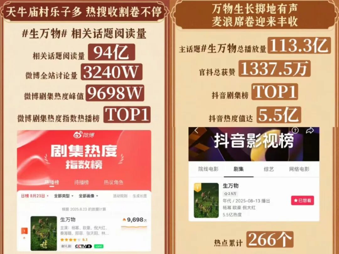《生万物》对作品的敬畏和对观众的尊重,也换来了观众的真诚回馈,《生万物》的社交讨论始终保持活跃。在微博上,《生万物》相关话题阅读量达94亿,全站讨论量3240万;抖音主话题总播放量113.3亿,热点累计266个。这些数据的背后,既是观众对好内容的认可,更是创作者与观众双向奔赴的最好证明。