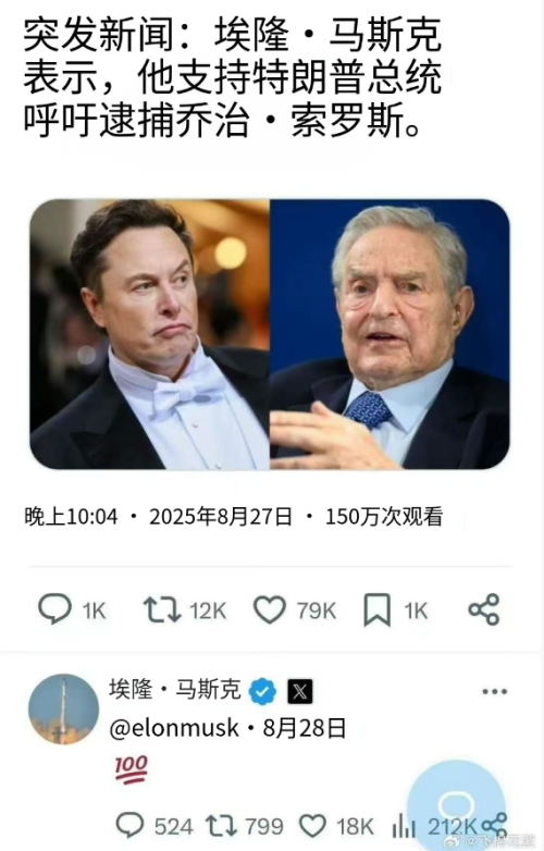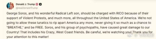 索罗斯何止在美国煽动暴乱,他掌握的基金会在世界各地都策动“颜色革命”。之前索罗斯支持的希拉里及一众民主党人物对特朗普也是穷追猛打。当时特朗普发帖后第一时间公开表态支持特朗普逮捕索罗斯的人是马斯克。