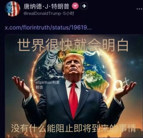 **引言:**特朗普要做什么大事情?在他的账户上发布了一张照片,上面写着他站在地球的背景下,世界很快就会明白……没有什么可以阻止即将到来的事情
