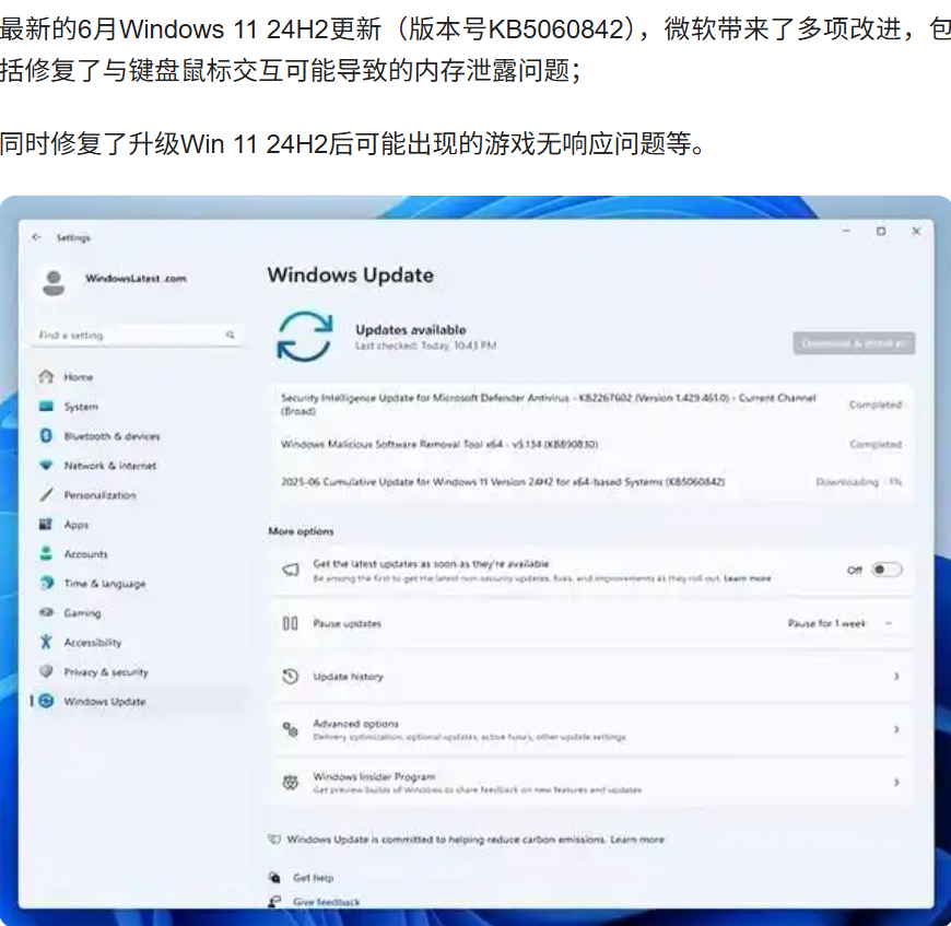 而在时间没隔多久的6月份,微软还被爆出 Win11 24H2 用户安装更新(KB5060842)后,会带来内存泄漏等问题。