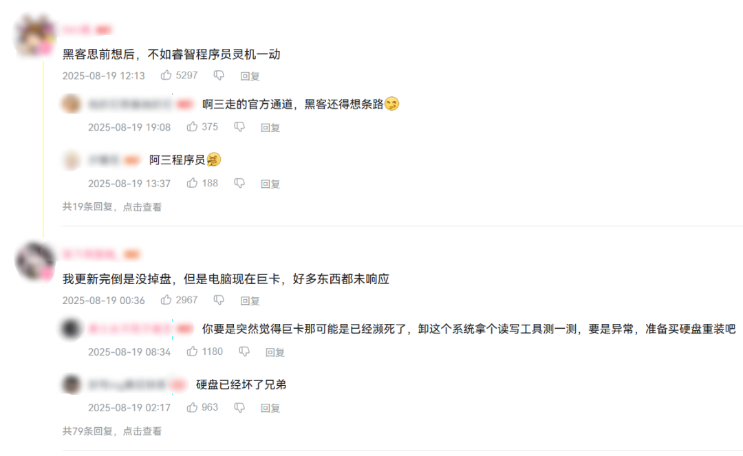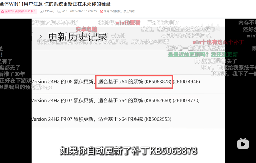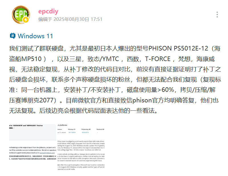 然而,这个事情还在不断地发酵。甚至这几天我们的后台私信里也总有差友一直在问 “为什么没做 Win11 的 KB5063878 更新导致掉盘的内容?”