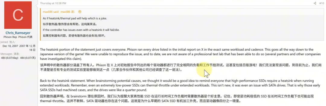 并且,群联为了确定不是自己的问题,还特意用日本老哥的同款硬盘,在同样的工作负载下进行了多轮测试,也是没能复现出问题。