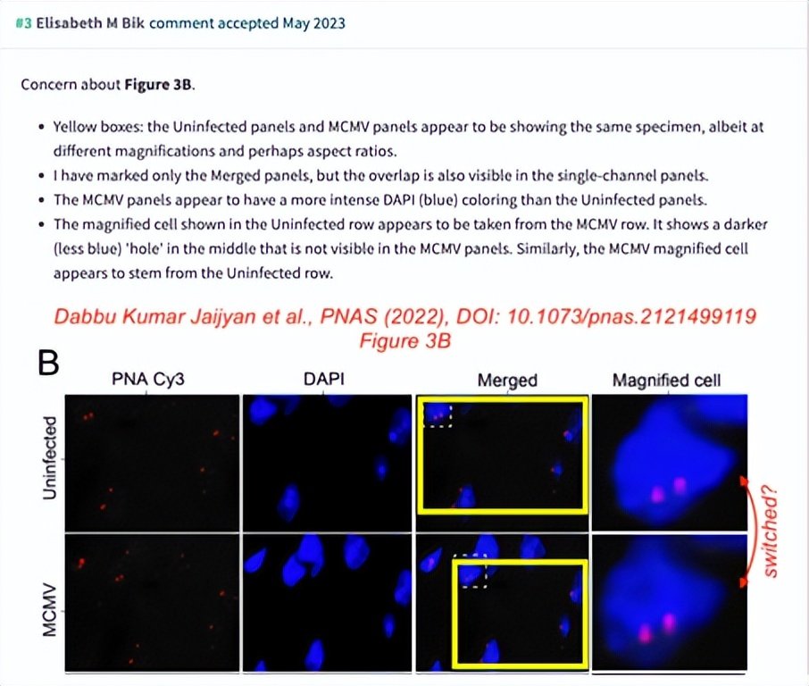 2023年5月,知名学术打假专家Elisabeth Bik在PubPeer上发出质询,指出文章中一组图片中有两张“似乎展示了同一个样品”。