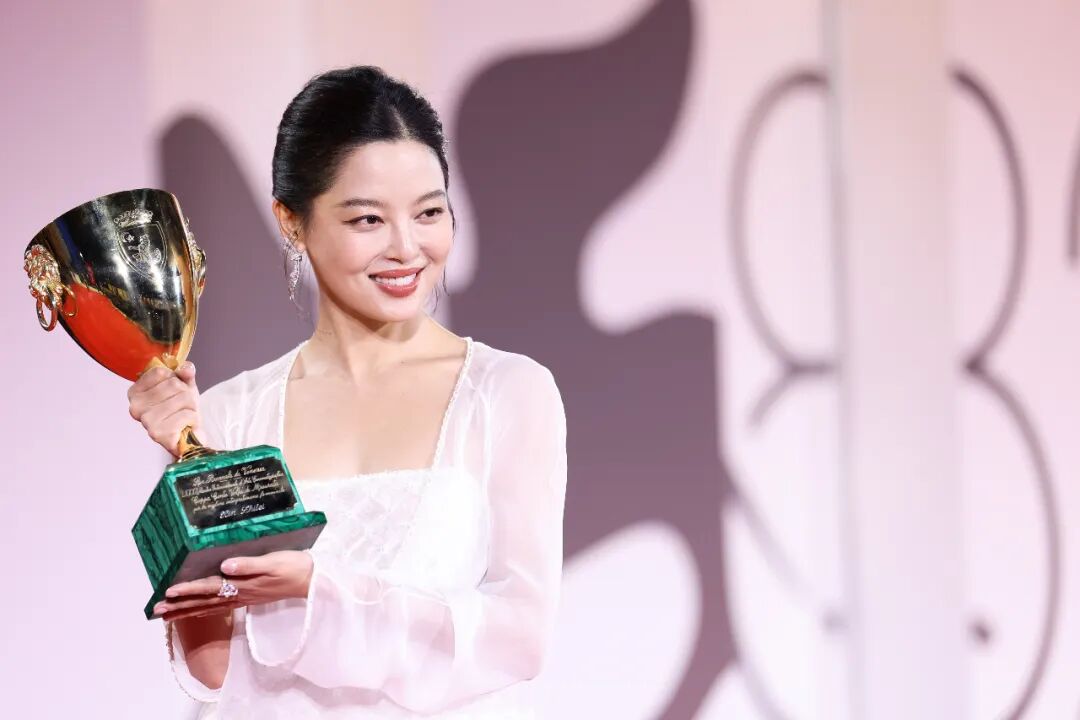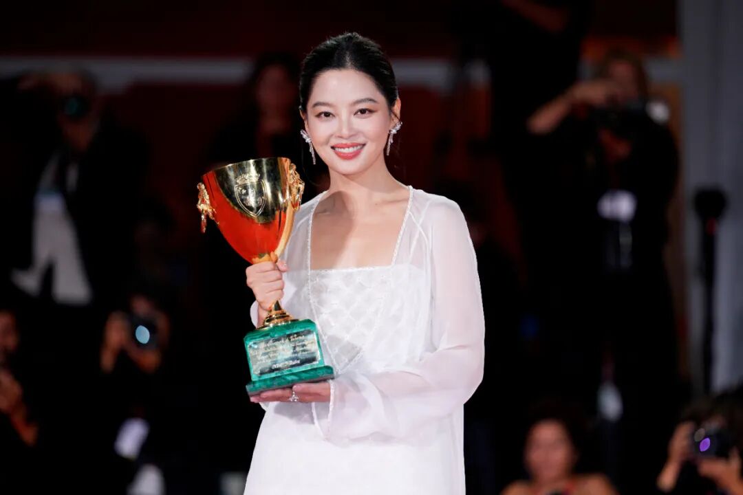 当地时间2025年9月6日,意大利威尼斯,第82届威尼斯国际电影节获奖者拍照环节,演员辛芷蕾手持最佳女演员“沃尔庇杯”奖杯。(视觉中国 供图)