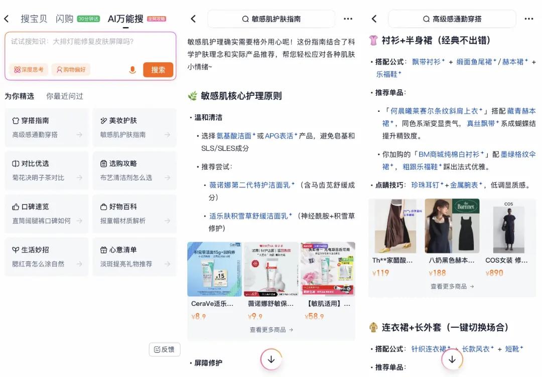 我发现在电商领域,AI正在系统性地重构行业。海外Shopify、TikTok、亚马逊不断加码AI,重新定义“人找货”与“货找人”的边界;国内,百度拉上罗永浩试水数字人直播,拼多多密集招募AI人才,淘天集团则直接亮出实力底牌——首次公布其电商大模型家族,覆盖电商的每一个环节;还有出现在淘宝APP搜索页的“AI 万能搜”,可深度思考,用户在对话中就能获得一份购物指南报告。这些动作都在表明,AI已从概念真正落地为“体验引擎”和“经营引擎”。