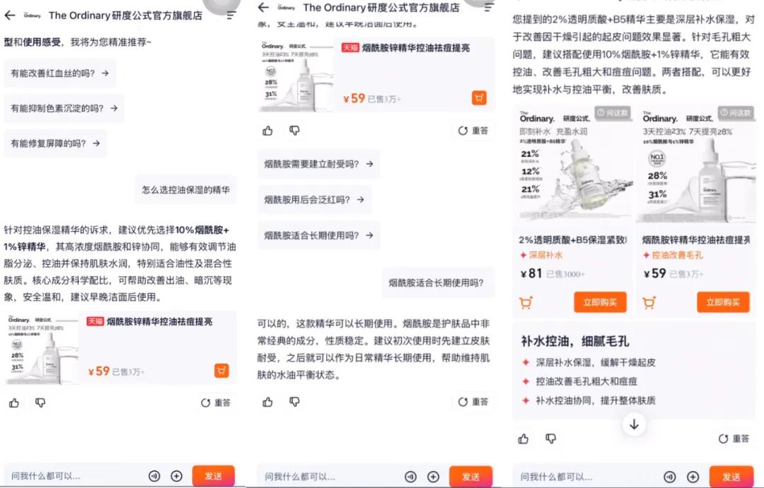 我最近就体验了The Ordinary天猫旗舰店内的“店铺AI导购助手”,点击店铺首页出现的“导购”进入对话界面,就能直观看到提示语和描述肤质及诉求的引导。