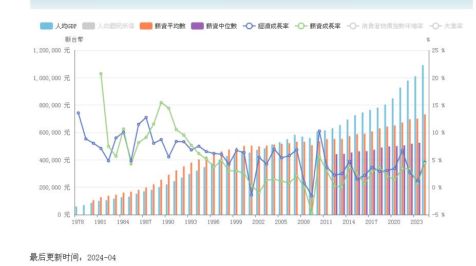淡蓝竖线是人均GDP,橘黄是平均工资,紫色是工资中位数,可以看到2004年以前平均工资涨得比GDP快,之后就是人均GDP涨得比平均工资快。而2012年开始统计人均工资中位数,可以发现中位数涨得非常慢,而且越来越涨得慢,因此可以估算是台积电相关产业的人收入高,拉高了平均值和中位数,但人均中位数后期就是人均GDP一半了。