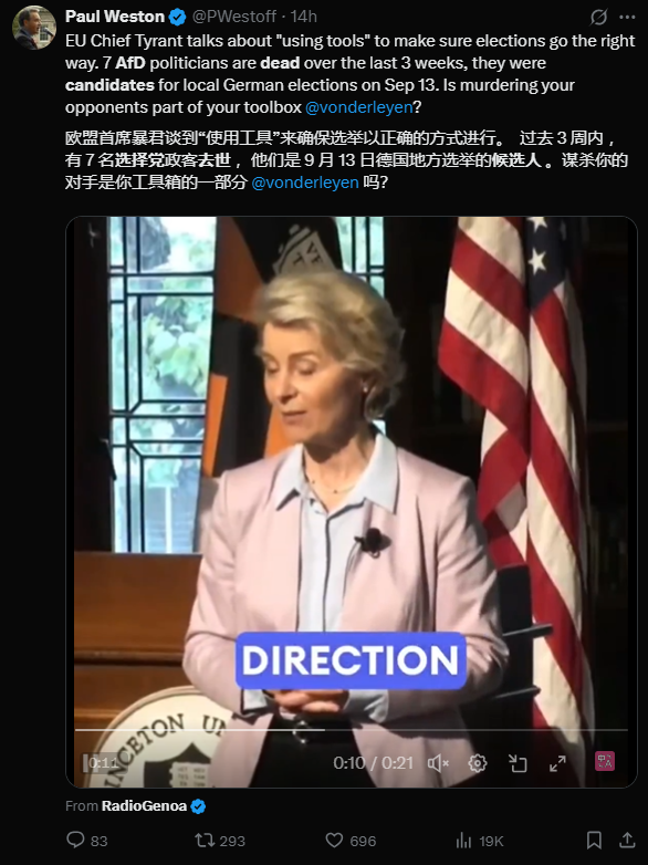 比如在这次德国北威州的地方选举上,马斯克除了转发认为AfD正常死亡太多,在统计学上几乎是不可能的帖子之外,还再次公开表态,如果不投票给AfD,“德国的末日就到了”。