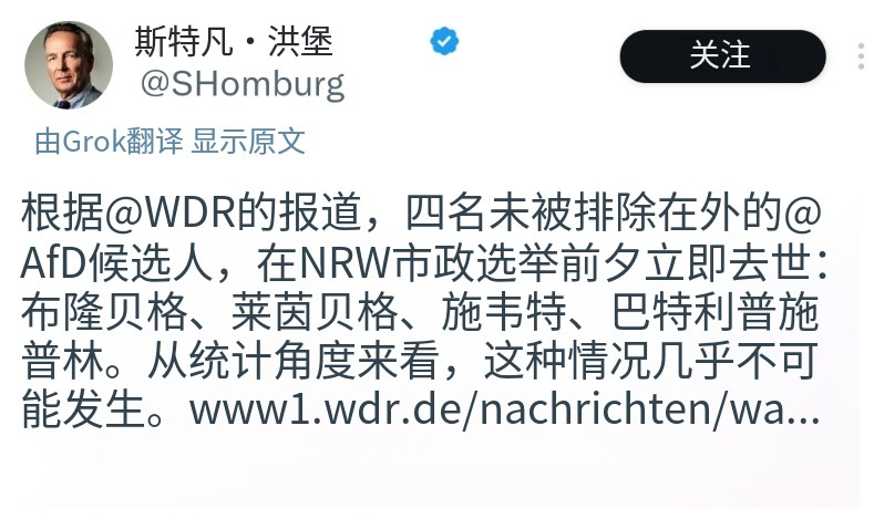 虽然德国选举官员公开表示,北威州有16名候选人死亡,其他政党也死了(一个党最多死1人),AfD独占7席只是意外。总的来说,一切正常。