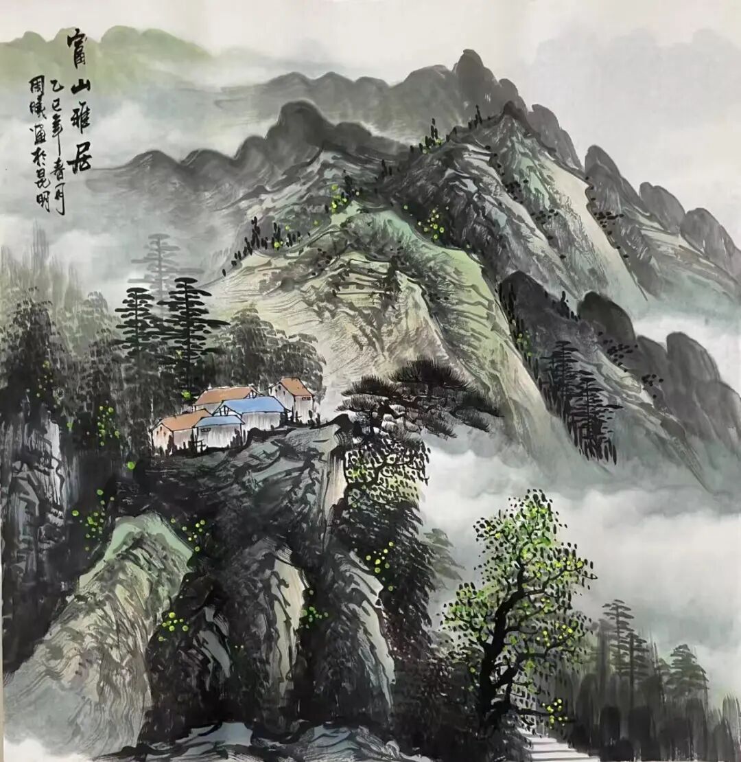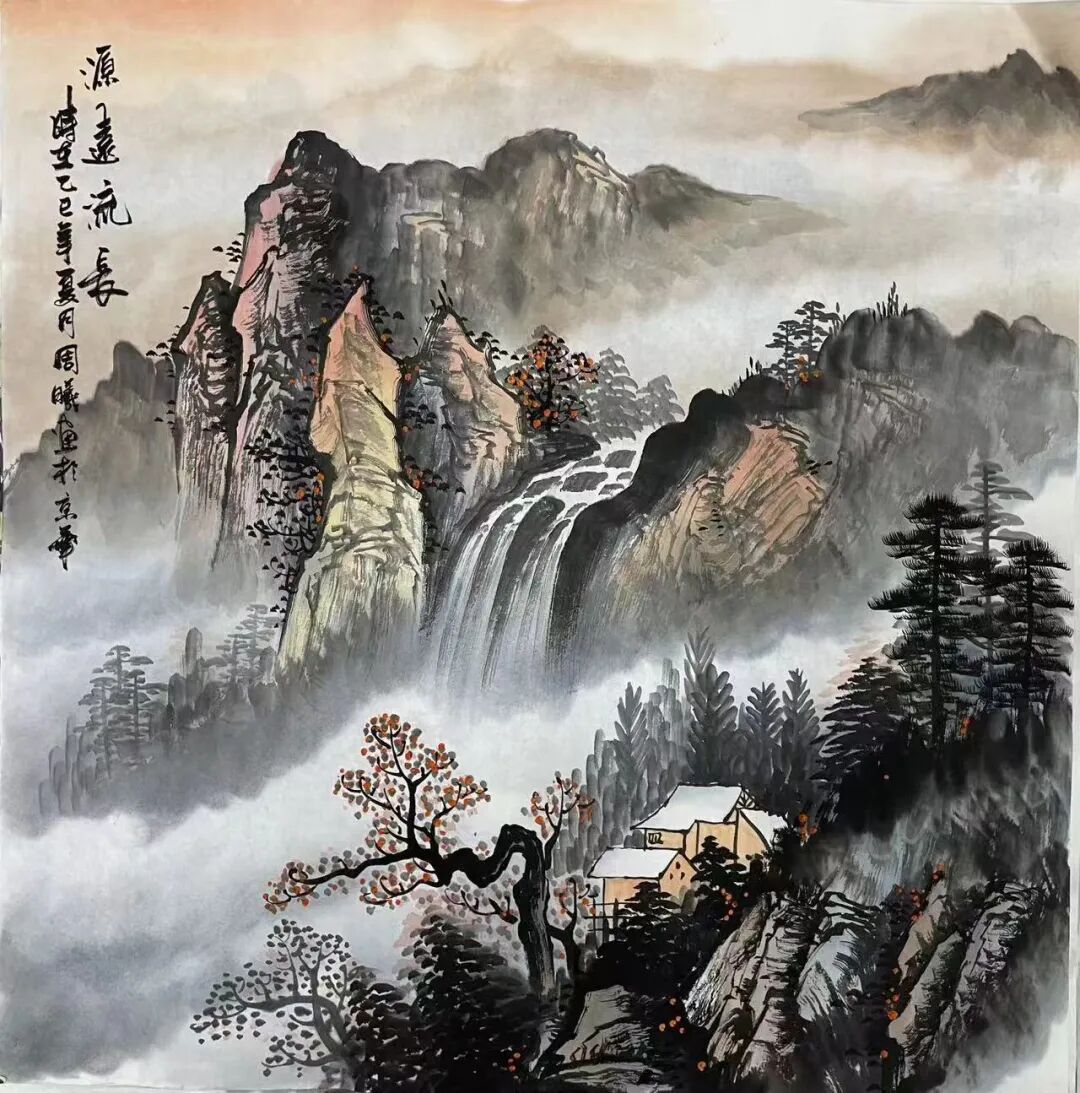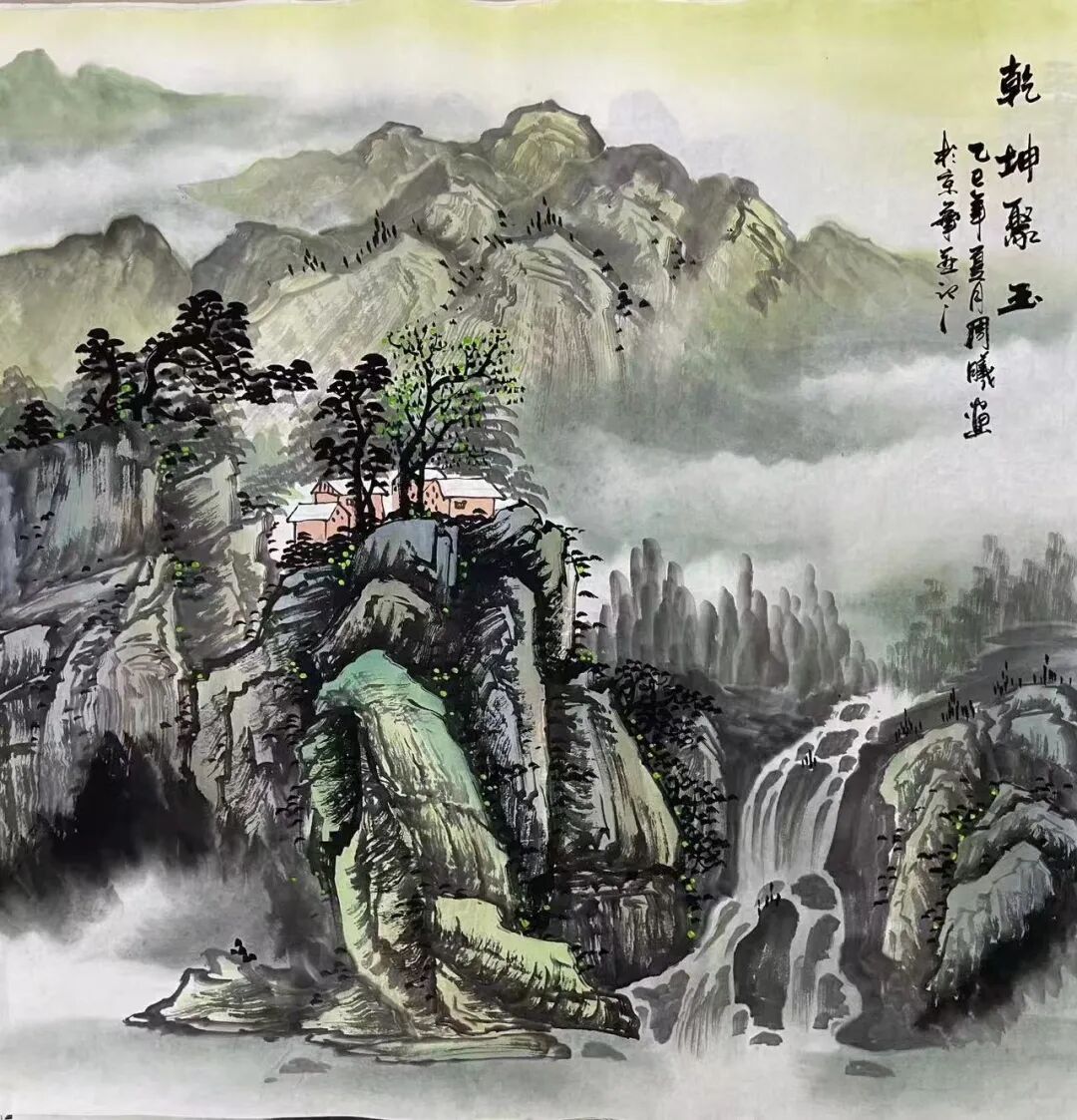 周曦对传统的理解远超技法层面,直抵中国艺术的精神内核。在他的山水画作《福地雅居》《乾坤聚玉》《源远流长》中,北宋的雄浑气象与元人的文人意趣完美融合,笔下的山石树木既有范宽的坚实厚重,又见倪瓒的疏朗空灵。更为难得的是,他将《周易》中的"天人合一"哲学观念转化为可视的艺术语言,使观者在欣赏画作时,不仅能感受到视觉的美感,更能体悟到中国传统哲学的深邃智慧。