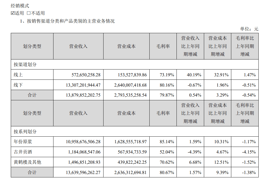 尽管线上营收同比增长40.19%,但这一增速并未转化为显著的市场份额提升。古井贡酒在线上渠道的布局已严重滞后,财报中,公司虽提及利用新媒体平台进行品牌传播,但从实际营收占比来看,这些举措并未取得实质性效果。