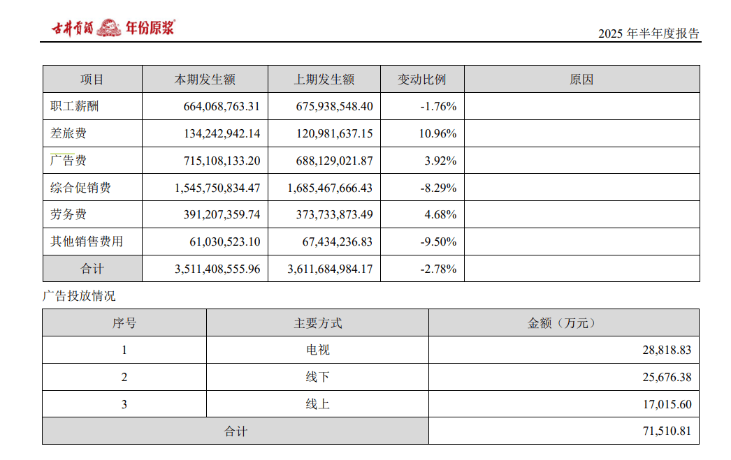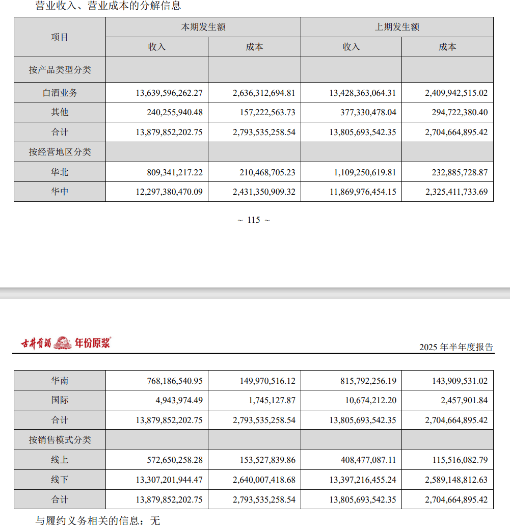 2025年上半年,其线上营收仅为5.73亿元,在总营收138.80亿元中所占比例仅4.13%。这一数据与行业内积极拥抱线上渠道的企业相比,差距巨大。茅台等头部企业线上占比超15%,泸州老窖线上占比也超10%,而古井贡酒却在这一赛道上远远落后。