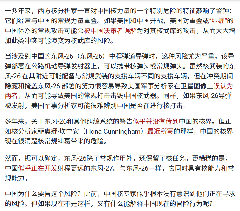 比如最近一篇文章的指责就很有意思。它指责中国的DF21,DF26和未来的DF27可能的核常兼备能力,会带来战略的不确定性,对核平衡会造成不利的影响,抱怨中国的政策实在是太复杂了。