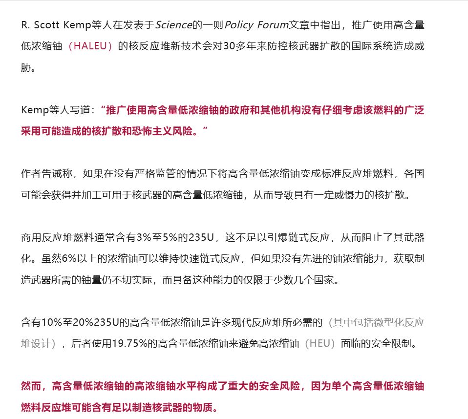 而同时,核电技术进步也会带来核扩散的不确定性。像当前美国新生代核电企业们画了一大堆PPT,这些项目被核军控学界质疑,原因很简单,传统商业核电站使用的燃料浓度一般在百分之五左右,而这些新一代的模块化反应堆需要使用浓度更高的燃料,这增加了扩散的风险。