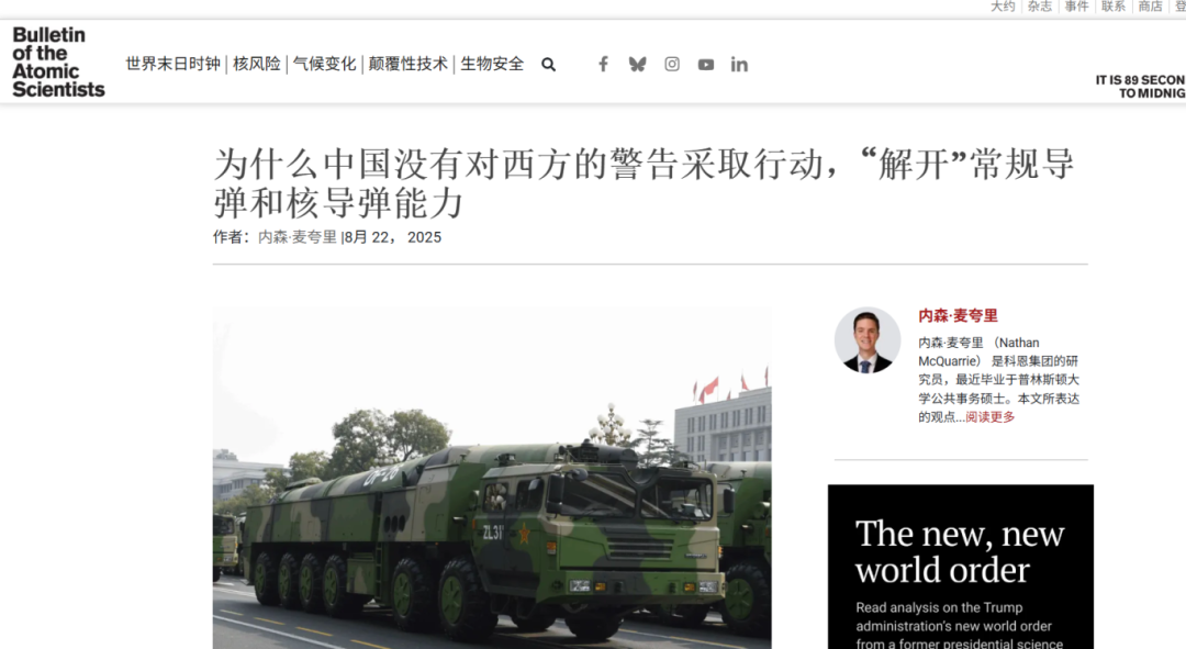 这篇文章发表于原子科学家公报(Bulletin of the Atomic Scientists),对这个名字有所了解的朋友,应该知道这是个有很长时间历史的科学家反战组织。他们对于核武器的态度,一般来说是要么是呼吁取消所有的核武器,要么就是希望建立严格的军控系统。这篇抱怨核常兼备的文就属于后面一种,属于军控学界文章。