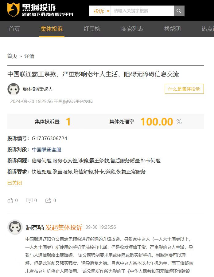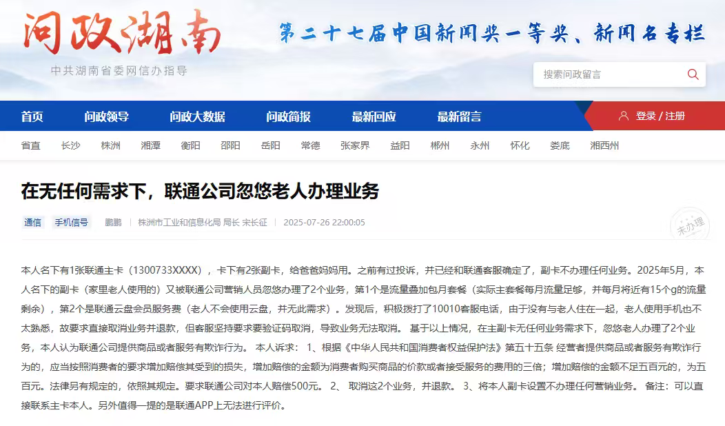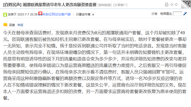 我到网上搜了一下,发现这样的事情还不在少数,像在今年7月份的时候,很多网友都在网上发帖申诉,称在无任何需求的情况下,联通公司故意诱导老人办理业务,更改高额资费套餐。