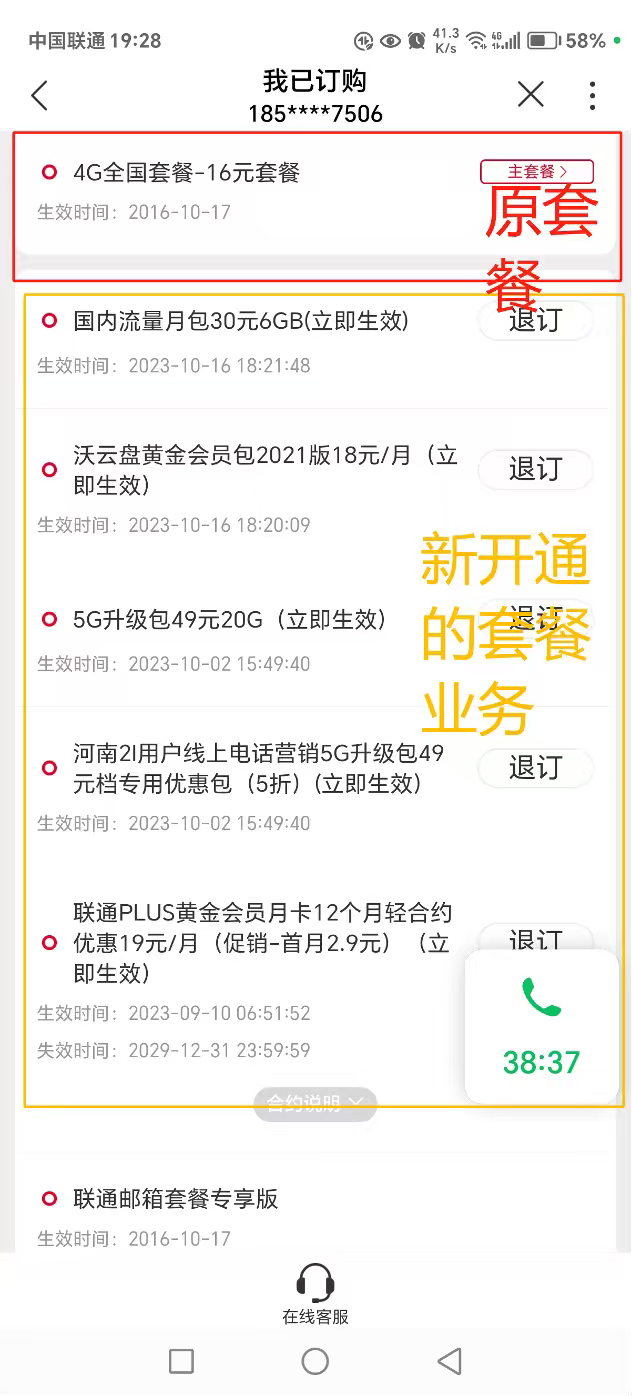 他登录到联通app上查了下账单,才发现是他母亲在用的副号凭空出现了两个新套餐。