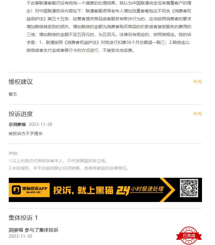 而且从流程上来看,很多时候联通几乎都不予理会诉求。大多数情况下,用户要么压根没发现,要么发现了再申请变更套餐,及时止损,很少出现死磕到底,要求赔偿的程度。
