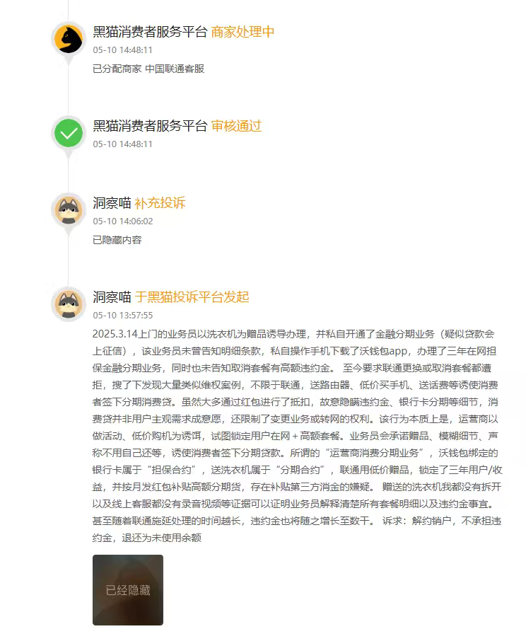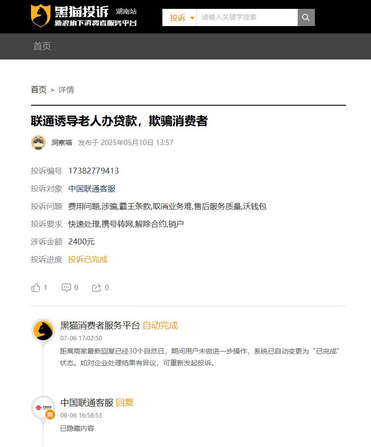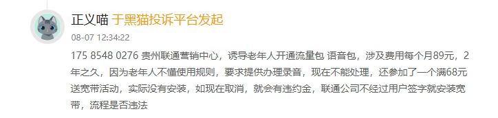 在黑猫投诉平台上,也有很多网友投诉联通诱导老人购买各种各样的服务,其中甚至还包括诱导老人贷款。
