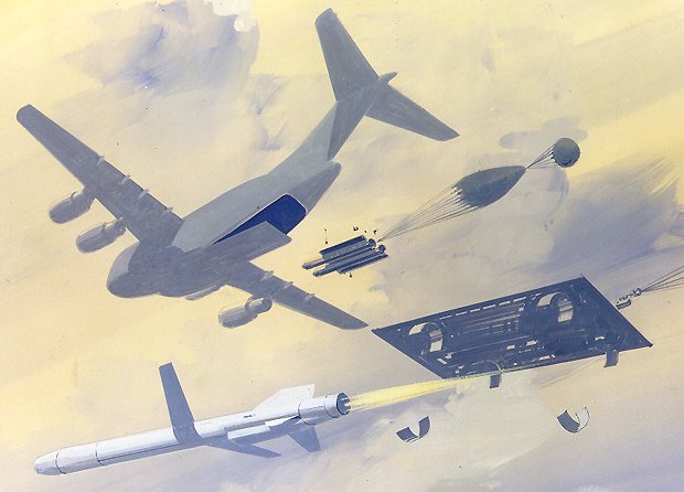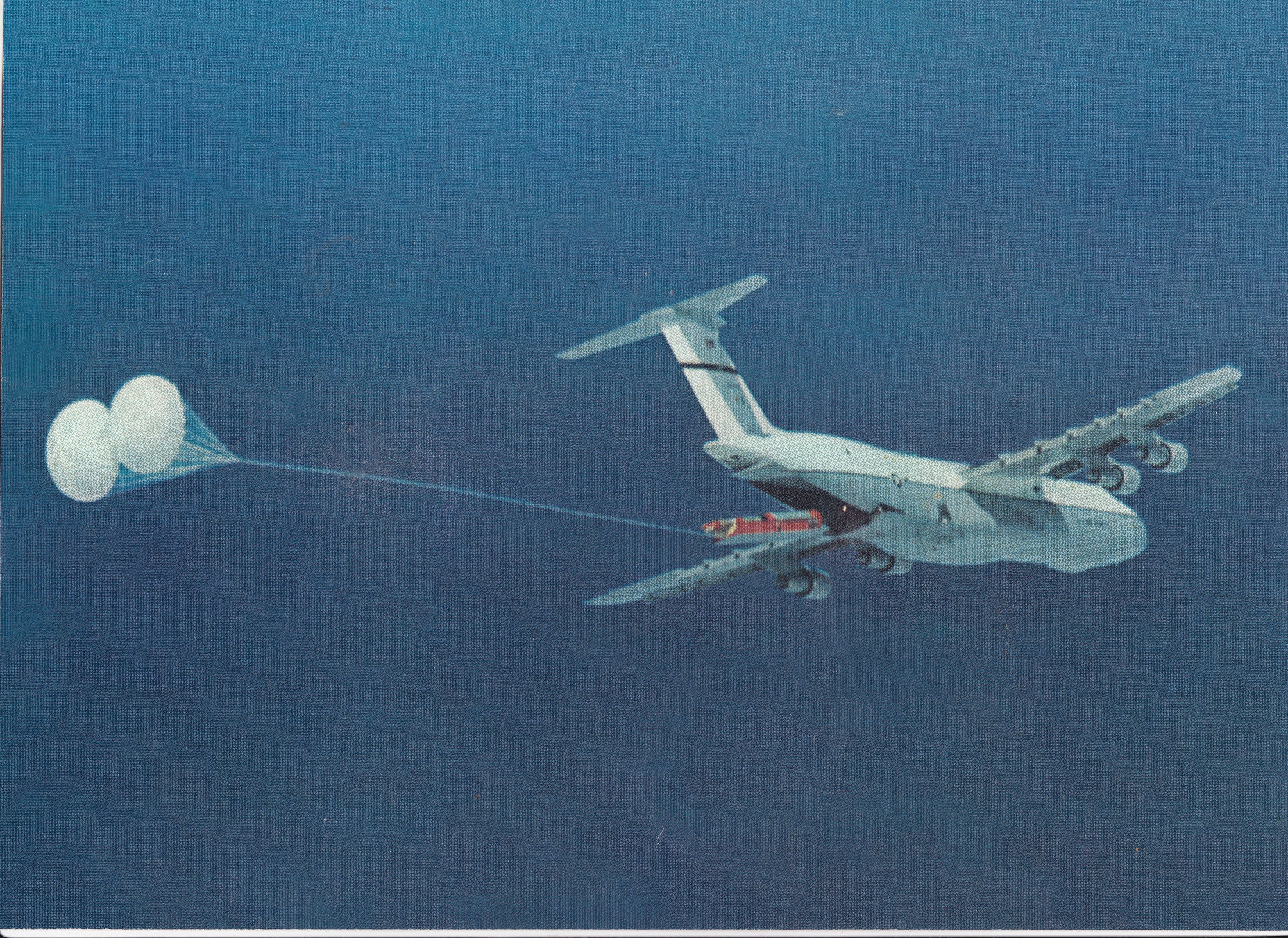 注意:导弹是头朝后拖出的。这是打开降落伞时头朝上的需要,否则需要减速伞再后,降落伞在前。两套伞不仅增加重量,还增加缠绕的危险。但头朝后带来气动稳定性的问题。导弹平底的尾部冲前,气动上不利。阻力不是问题,稳定才是问题。这决定了C-5在空投的时候必须以最低速度,避免导弹被气流吹得失稳,降落伞打开后都止不住晃动,影响发射。这么复杂的发射动作,还有空投的高度、速度限制,实战性不强。美国空军在试验成功后,直接放弃了这个思路。