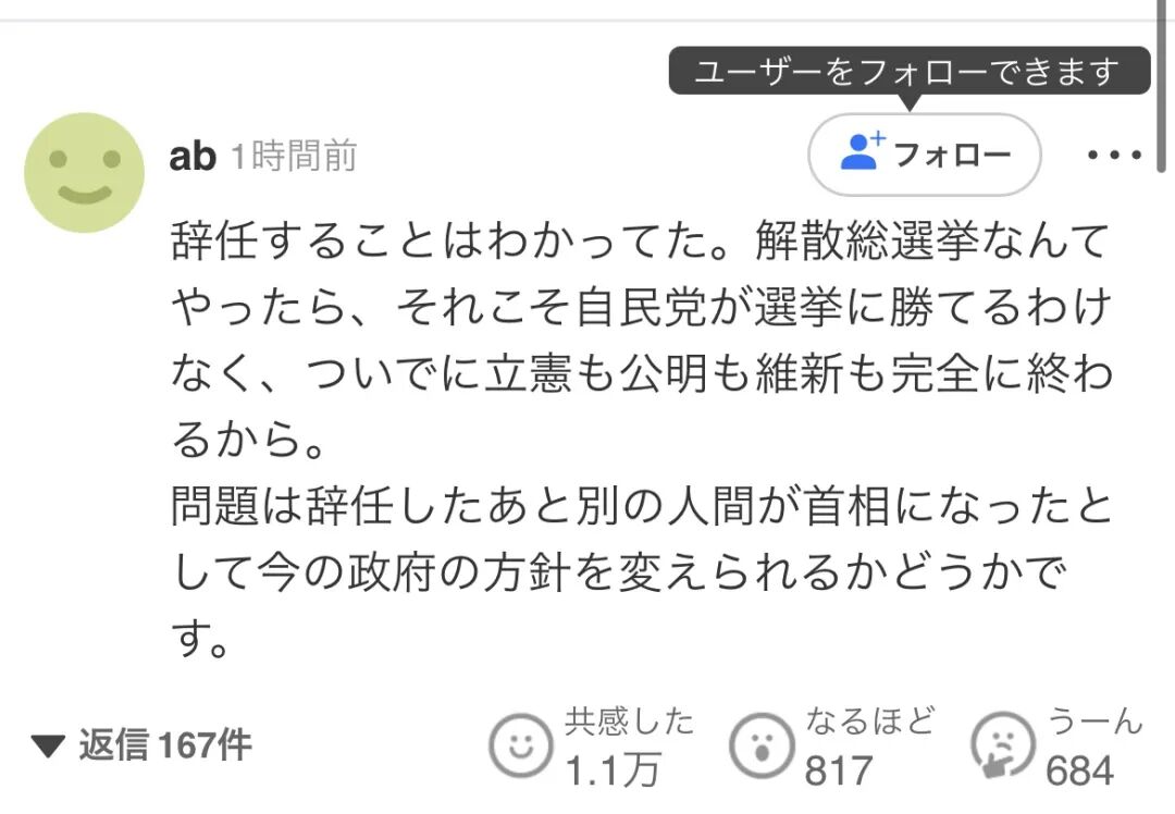 “可以预料到这次辞职。如果解散,进行总选举的话,自民党根本不可能赢得选举,顺便立宪、公明、维新可能也将彻底结束。问题是辞职后由别人当首相,能不能改变现在政府的方针?”