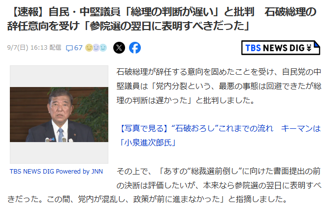 对于石破茂突然宣布要辞职,自民党内部却并不领情,一名中坚议员批评道:“虽然避免了党内分裂这种最糟糕的局面,但首相的判断太晚了。”