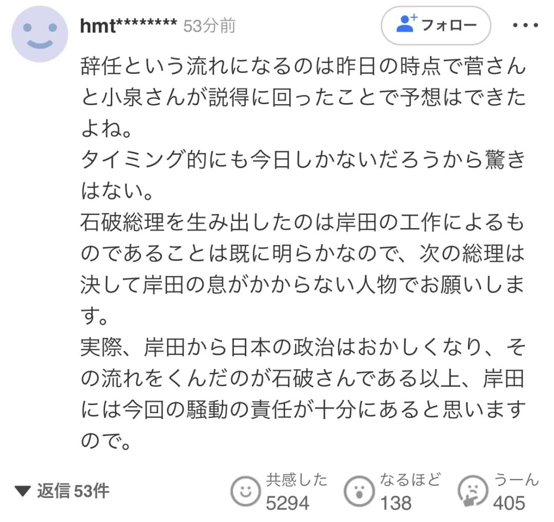 “原本对于辞职的事,昨天的时候菅先生和小泉先生已经出面劝说过了,其实可以预想到的吧。时机上也只有今天了,所以我并不惊讶。石破首相的诞生原本是多亏了岸田的工作,这一点已经很清楚了,所以下一任首相请选一位绝对不受岸田影响的人物。实际上,从岸田开始日本的政治就变得奇怪了,既然引领这一潮流的是石破先生,我还是认为岸田应该对这次骚动负有充分的责任。”