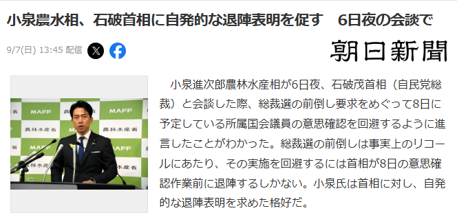而在昨晚,日媒也报道称,前首相菅义伟和农林水产大臣小泉进次郎与石破茂首相进行了会谈,两人都表示希望石破茂能主动辞职,理由是为了避免党内分裂。