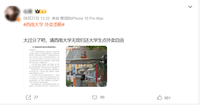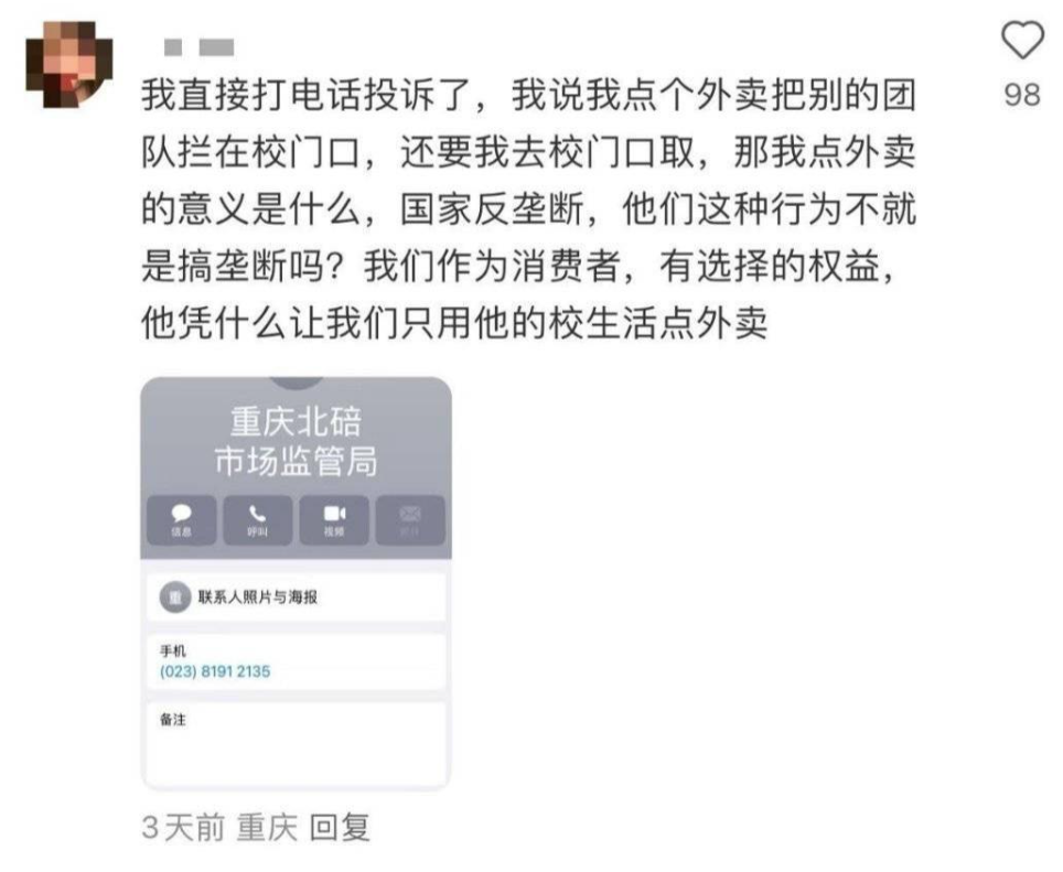 只可惜,霸占高位的并不是什么美闻。简单来说,就是西南大学的外卖搞起了独家代理。