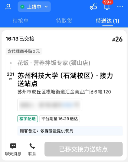 如果是原始的微信群运送,一份餐在送到校门口交给下一棒后。软件上就会显示已完成,你再也拿不到超时费之类的补偿。