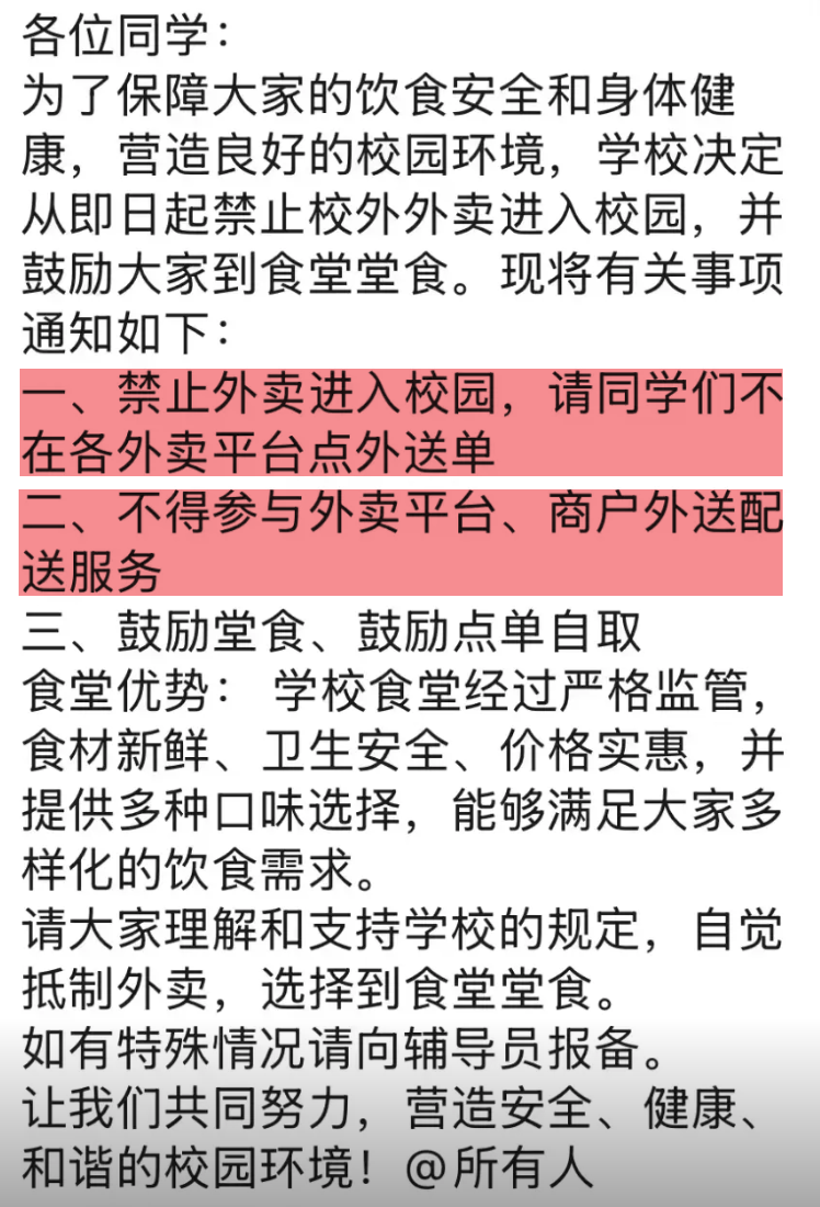 像有的学校就明确不允许学生在校内送外卖,硬生生把吃饭****搞成了游击战。
