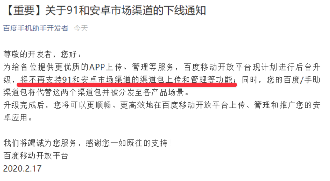 比如早在 2020 年,91 助手和它的兄弟安卓市场就停止应用商店的分发业务,关闭了渠道包的上传和管理。
