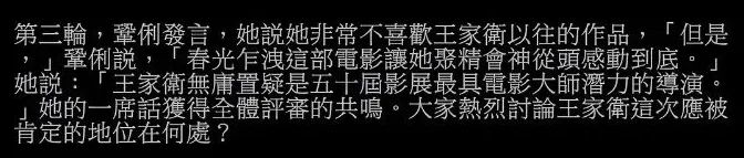 先是以各种理由拒绝给高票的《春光乍泄》大奖,给王家卫分了一个次奖后又各种阻挠梁朝伟拿影帝,全然不顾其他评审意见。