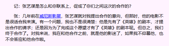 其实巩俐一向不喜欢王家卫的风格,但力捧《春光乍泄》不是为了做姿态,而是这部作品真的让她对王家卫改观,认同了他的艺术。