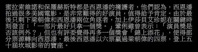 对比之下,辛芷蕾这次的奖拿得更显难得,不掺杂那么多的算计和利益分配,只关乎一个优秀女演员的自我实现,和另一个优秀女演员的努力成全。