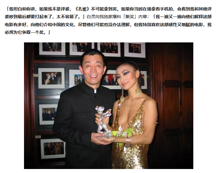 “我坦白和你讲,如果我不是评委,《孔雀》不可能拿到奖。如果你当时在场拿着手机拍,会看到我和其他评委吵到最后都要打起来了,太不容易了。”