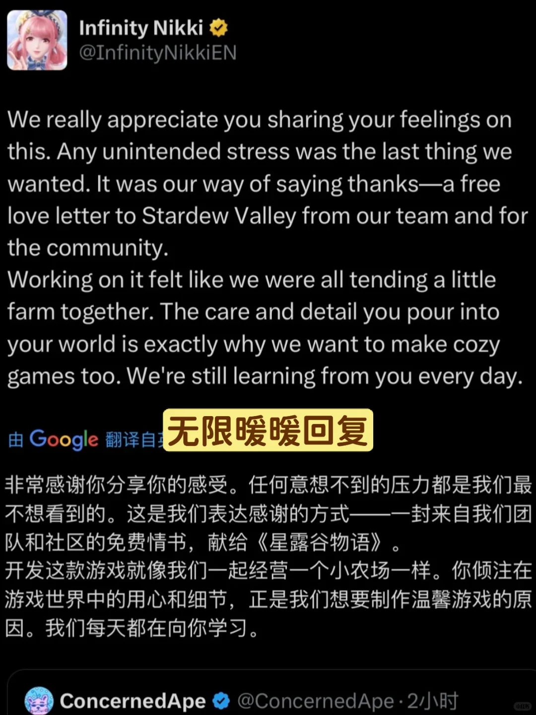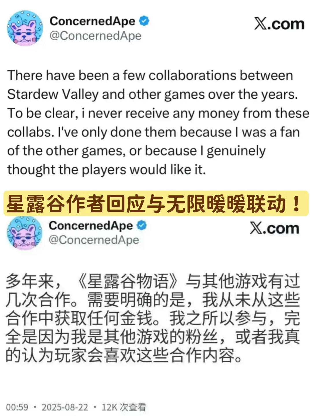 更别提,之后星露谷制作人ConcernedApe亲自发布推特,表达了对这次联动的期待,同时,对联动所牵扯出的各种质疑与争论进行了回应。