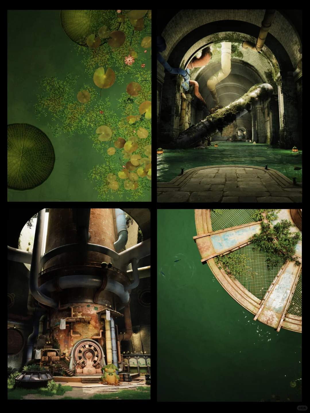 管道错综复杂、居住着青蛙们的洞井;藏着无数愿望千纸鹤、气势恢宏的愿望梦境仓库;充斥着幽灵,童趣又诡异的呜呜列车;精致、干净的美妆工坊;神秘、悠久的古铸剑遗址……