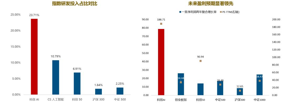 科创板人工智能指数的研发投入占营业收入为23.71%,高于中证人工智能指数的10.79%和各类常见宽基指数。特别是从未来盈利预期来看,科创板人工智能指数的一致净利润两年复合增长率大幅领先于其它指数,说明它未来盈利预期更高,成长性更好。