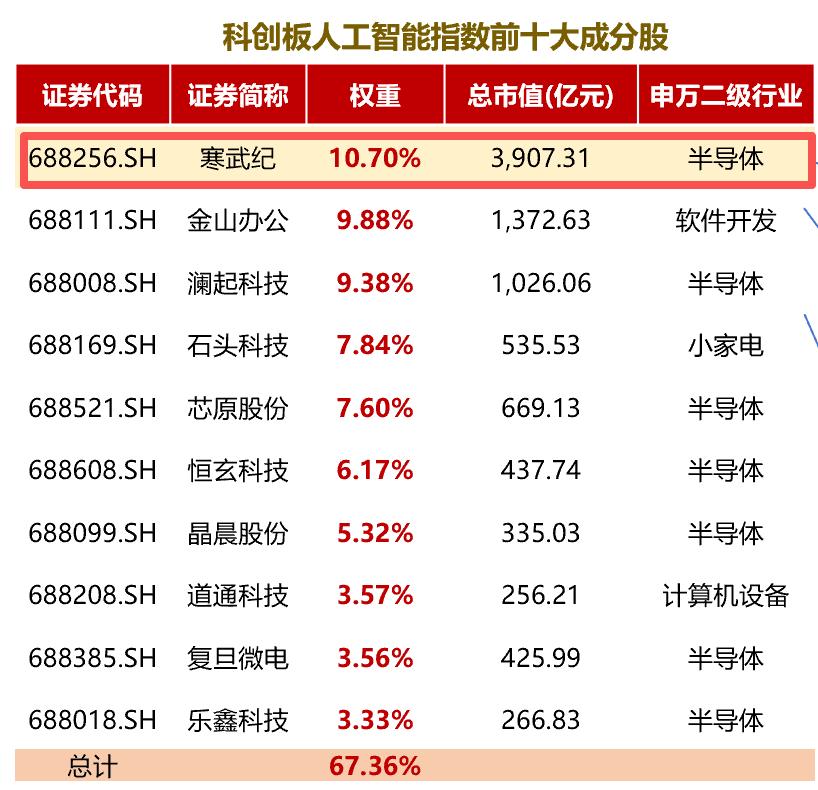 **目前上证科创板人工智能指数是寒武纪权重占比最高的人工智能指数。**其中,半导体行业以47.81%的权重占据主导,IT服务和软件开发也分别占比15.00%和16.87%。显著突出在算力基础、软件生态及行业应用等方面,意味着直接切入AI产业核心环节,更精准、更纯粹地把握AI时代的增长机遇。假设寒武纪再迎来一轮猛涨,华夏上证科创板人工智能ETF联接A(024411)就能轻松分享这波红利,不过也别急,毕竟高盛可是对寒武纪的目标价看到了1835元。