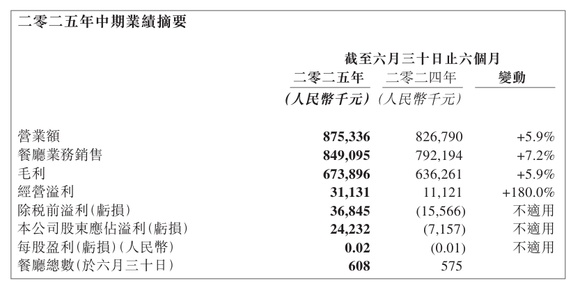 近日,味千中国(HK:00538)发布了2025年中期业绩。味千中国上半年收入8.75亿元,同比上涨5.9%;净利润为0.37亿元,实现也扭亏为盈。