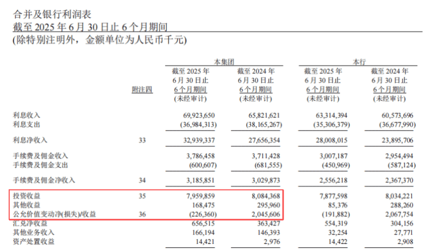 具体而言,2025年上半年,江苏银行的投资收益和公允价值变动损益分别为79.6亿元、-2.26亿元,均较上年同期萎缩,特别是公允价值变动损益由盈转亏,对业绩造成拖累。