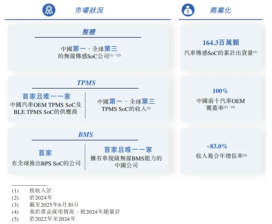 据招股书,琻捷电子是无线传感SoC领域的全球领导者与先行者,致力于提供创新的传感芯片。根据弗若斯特沙利文报告,按2024年收入计,琻捷电子是全球第三大汽车无线传感SoC公司,也是中国最大的汽车无线传感SoC公司。