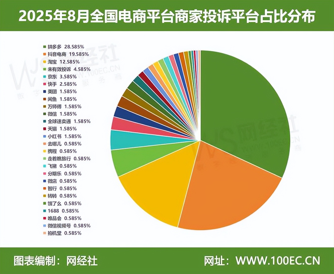 据“电诉宝”显示,8月电商平台投诉占比依次为:拼多多(28.585%)、抖音电商(19.585%)、淘宝(12.585%)、京东(3.585%)、快手(2.585%)、美团(1.585%)、闲鱼(1.585%)、万师傅(1.585%)、微信(1.585%)、全球速卖通(1.585%)、天猫(1.585%)、小红书(1.585%)、去哪儿(0.585%)、携程(0.585%)、走着瞧旅行(0.585%)、飞猪(0.585%)、分期乐(0.585%)、微店(0.585%)、智行(0.585%)、转转(0.585%)、饿了么(0.585%)、1688(0.585%)、唯品会(0.585%)、微信视频号(0.585%)、拍机堂(0.585%)。