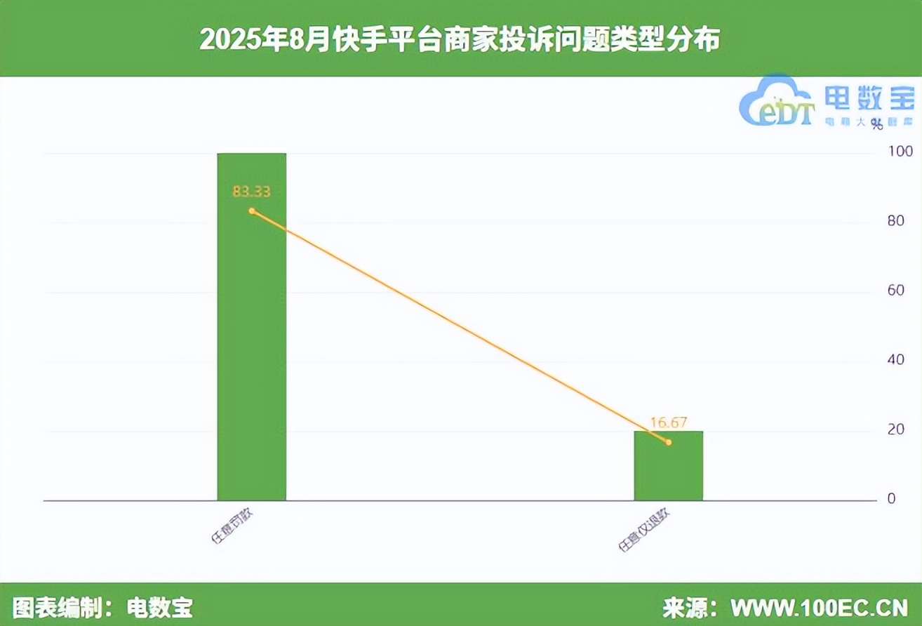 据“电诉宝”显示,8月快手电商平台涉及的数百份商家投诉,问题类型主要集中在:任意罚款(83.33%)、任意仅退款(16.67%)。