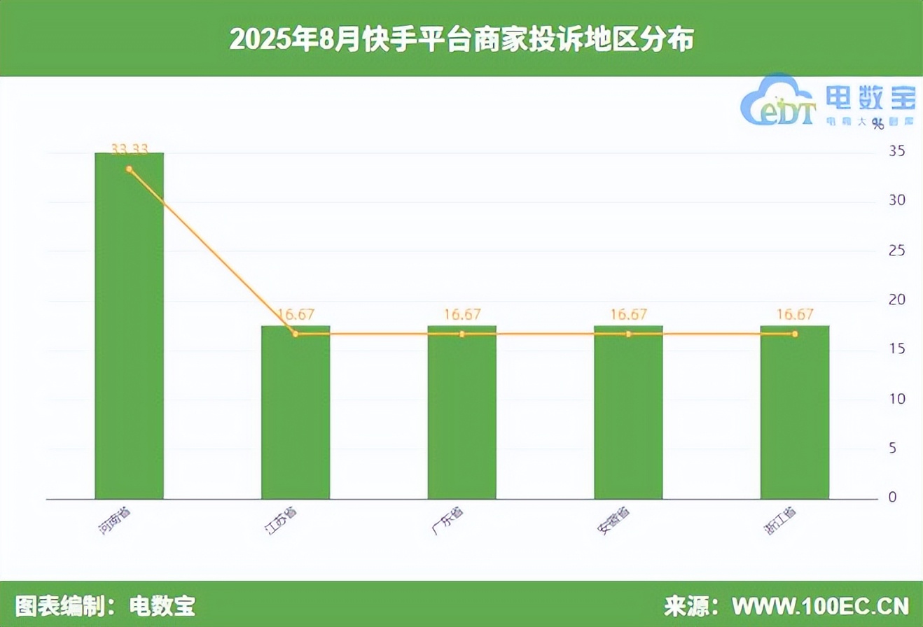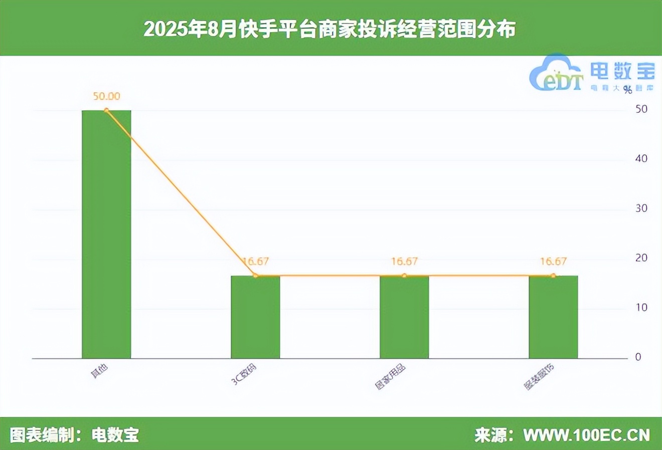 8月,投诉快手电商平台的商家经营类目TOP3依次为3C数码(16.67%)、服装服饰(16.67%)、居家用品(16.67%)。