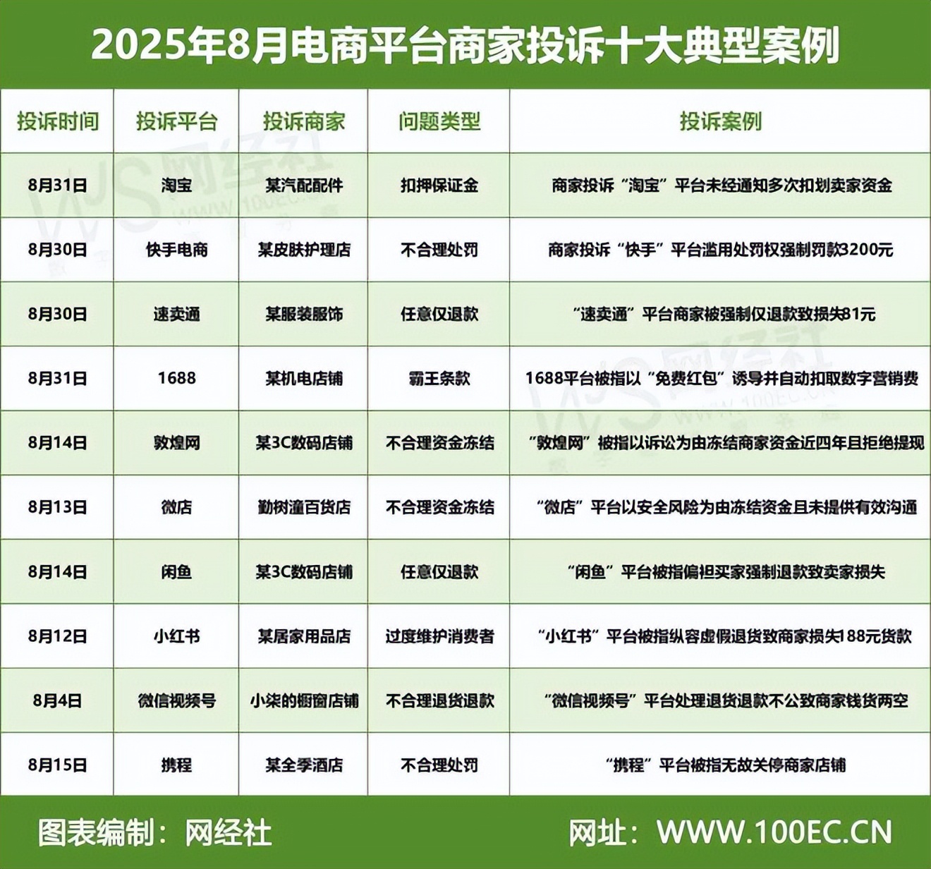 据“电诉宝”受理商家维权案例,我们从中选取十大典型投诉案例,涉及淘宝、快手电商、速卖通、1688、敦煌网、微店、闲鱼、小红书、微信视频号、携程。涉及问题包括:扣押保证金、不合理罚款、任意仅退款、霸王条款、不合理资金冻结、过度维护消费者等。