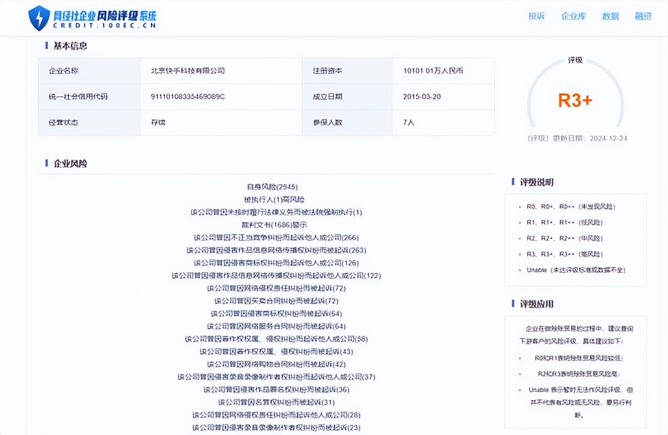 据网经社“企业风险评级系统”显示,“快手”所属北京快手科技有限公司的风险评级为R3+,公司目前所处高风险。