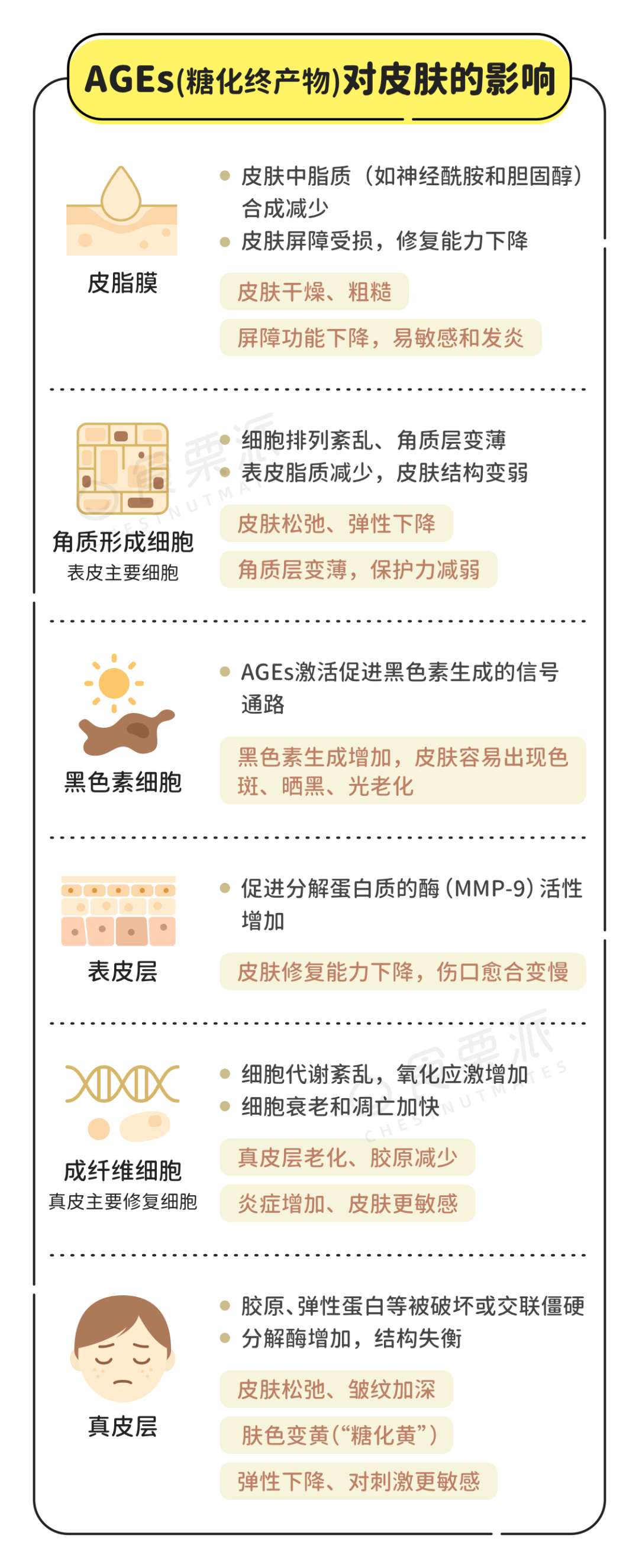 AGEs还会破坏皮肤屏障、阻碍皮肤伤口愈合、促进黑色素生成……可以说,AGEs对皮肤的影响是全方位的[1]。